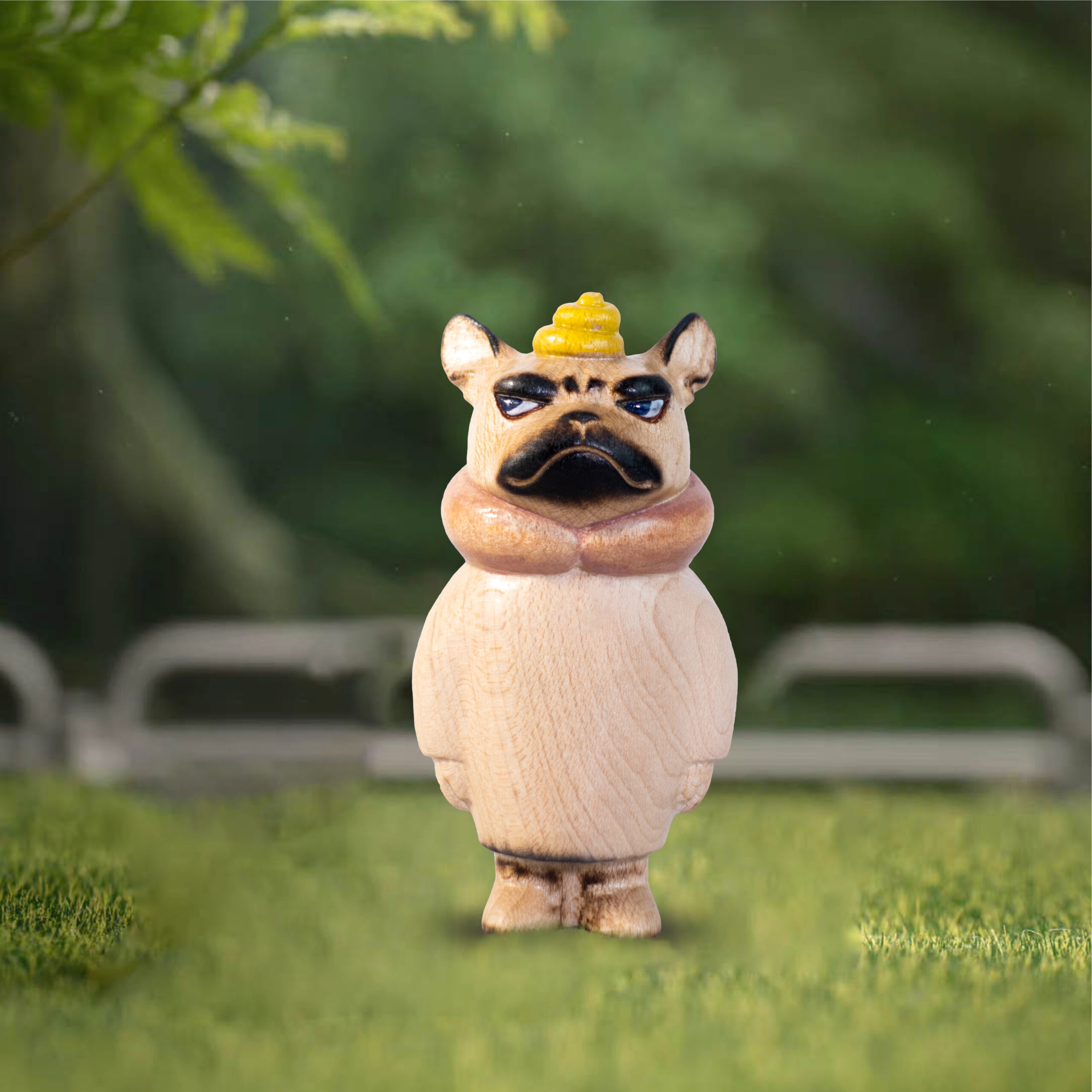 Dog — Going to Poop, with poop on the head and a protective collar around the neck.